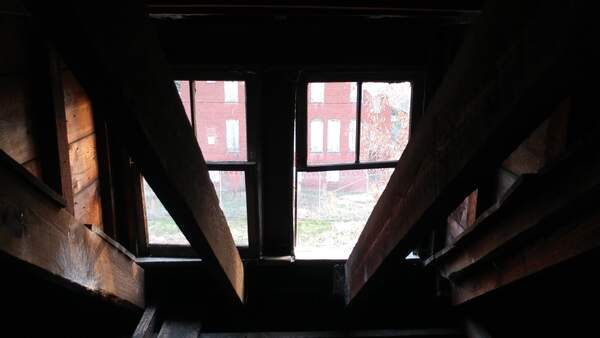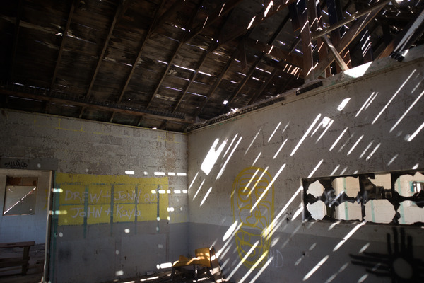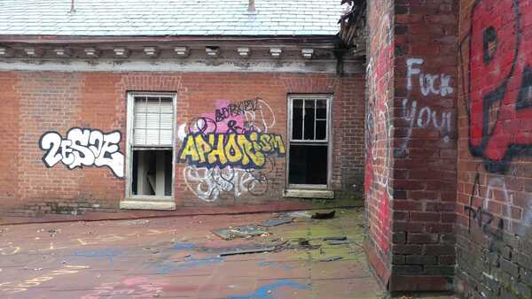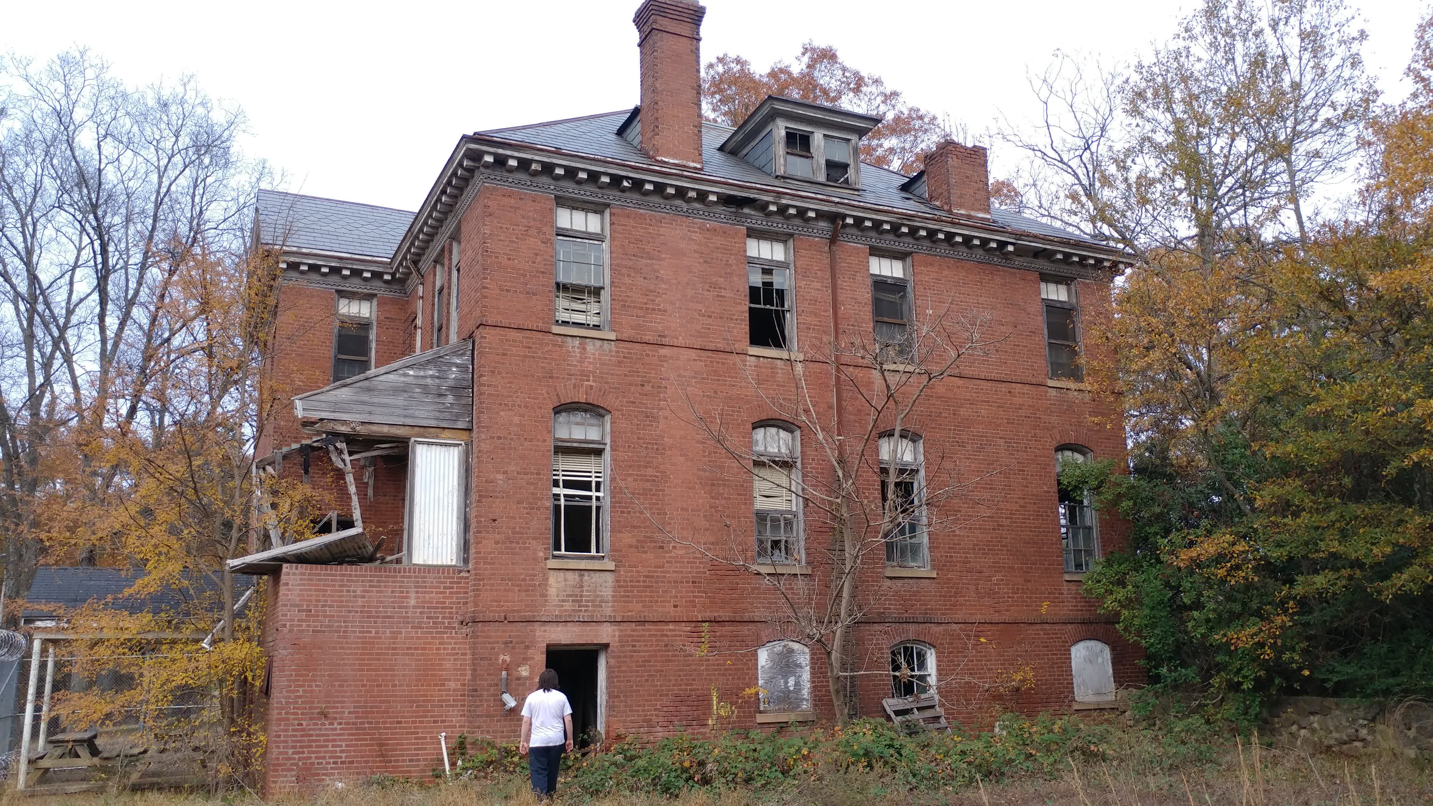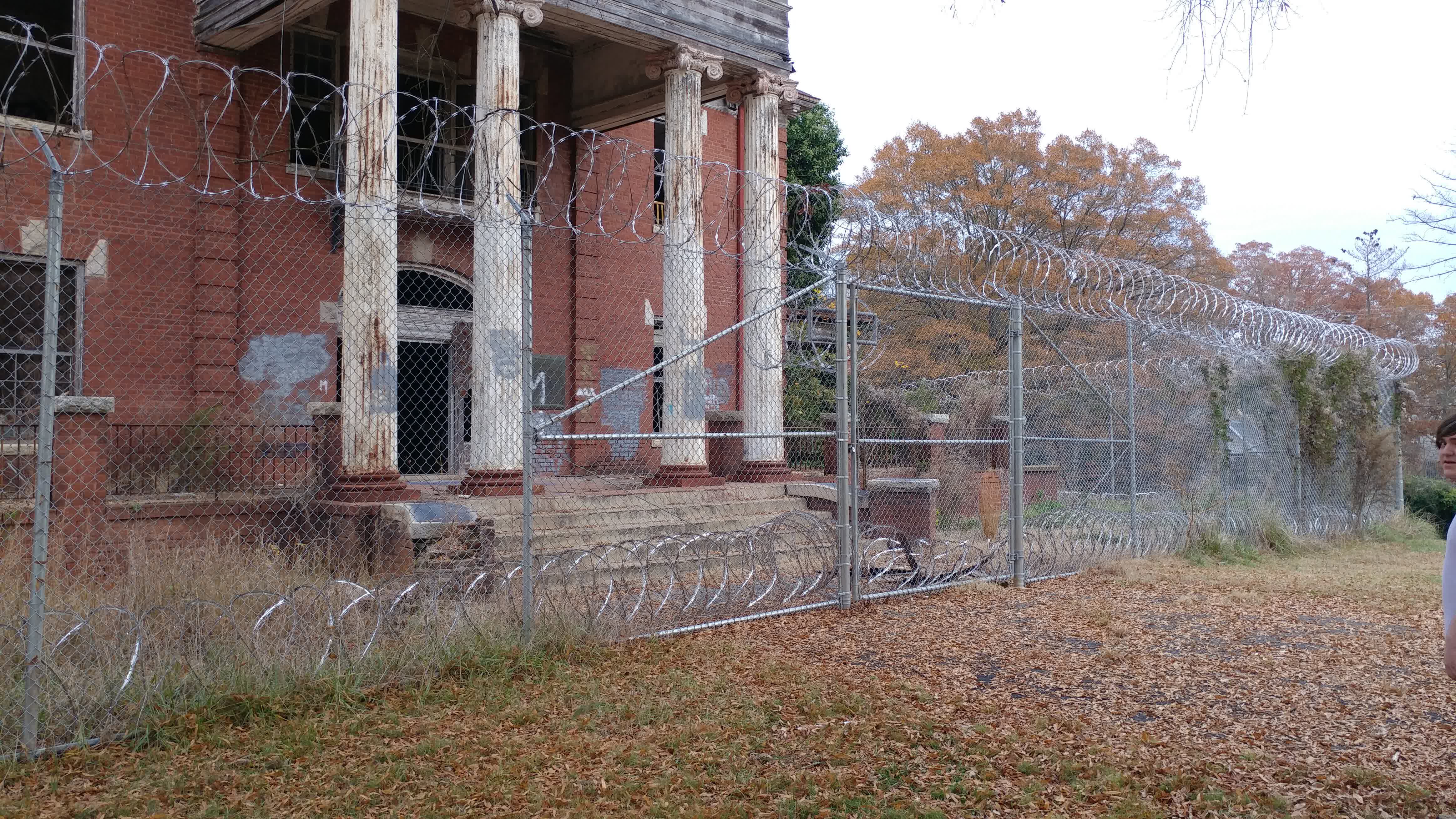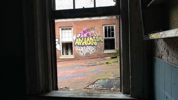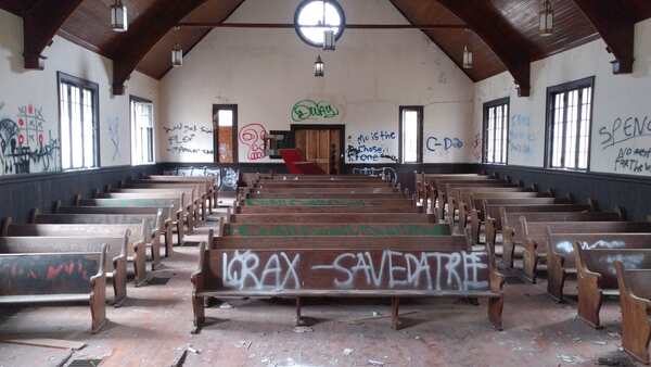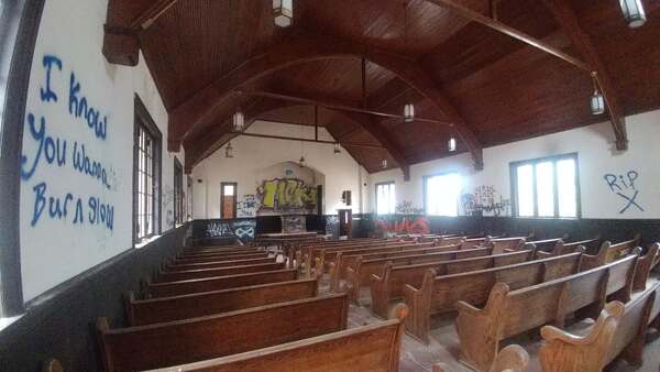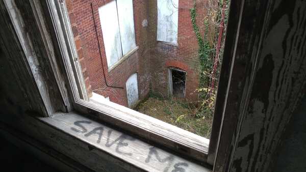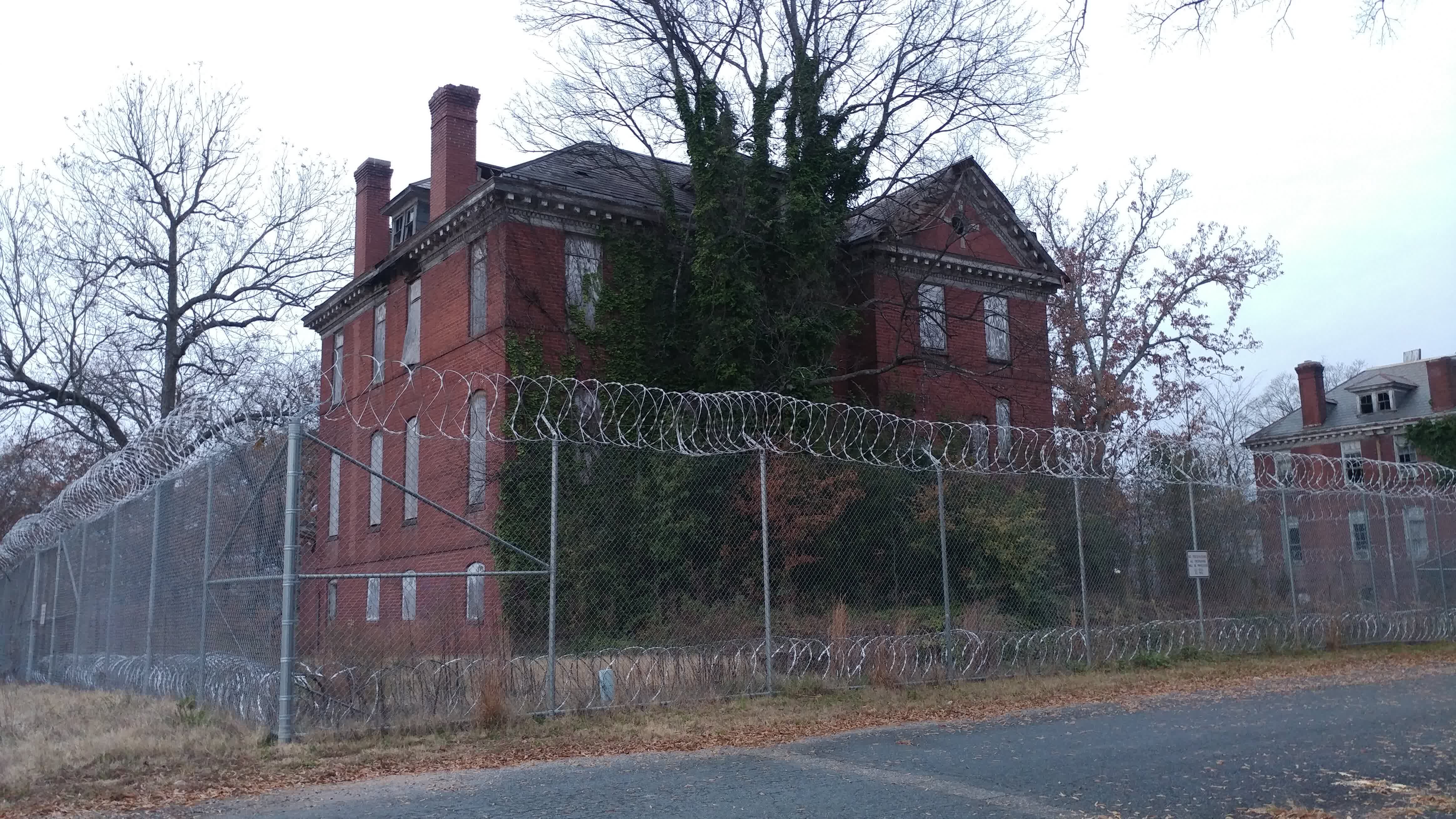 Abandoned juvenile detention center built in 1909 and a church across the street